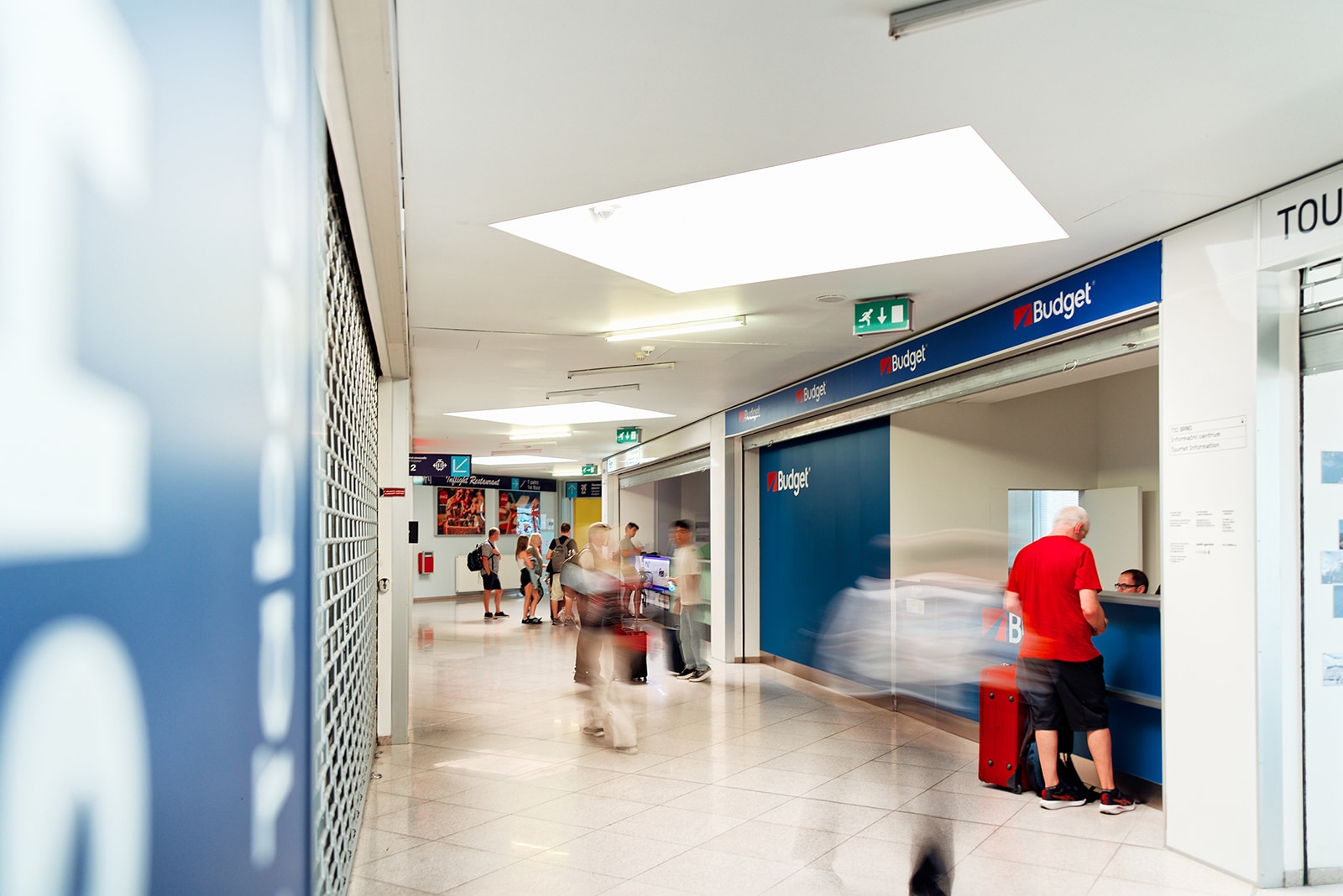 Autopůjčovny se nachází ve spojovací chodbě mezi příletovou a odletovou halou.