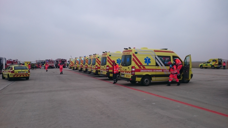 Do místa, kde se podle předem připraveného scénáře po nárazu autobusu a letounu zlomilo jeho pravé křídlo, a začalo unikat palivo, vyrazily také sanitky ZZS JMK.